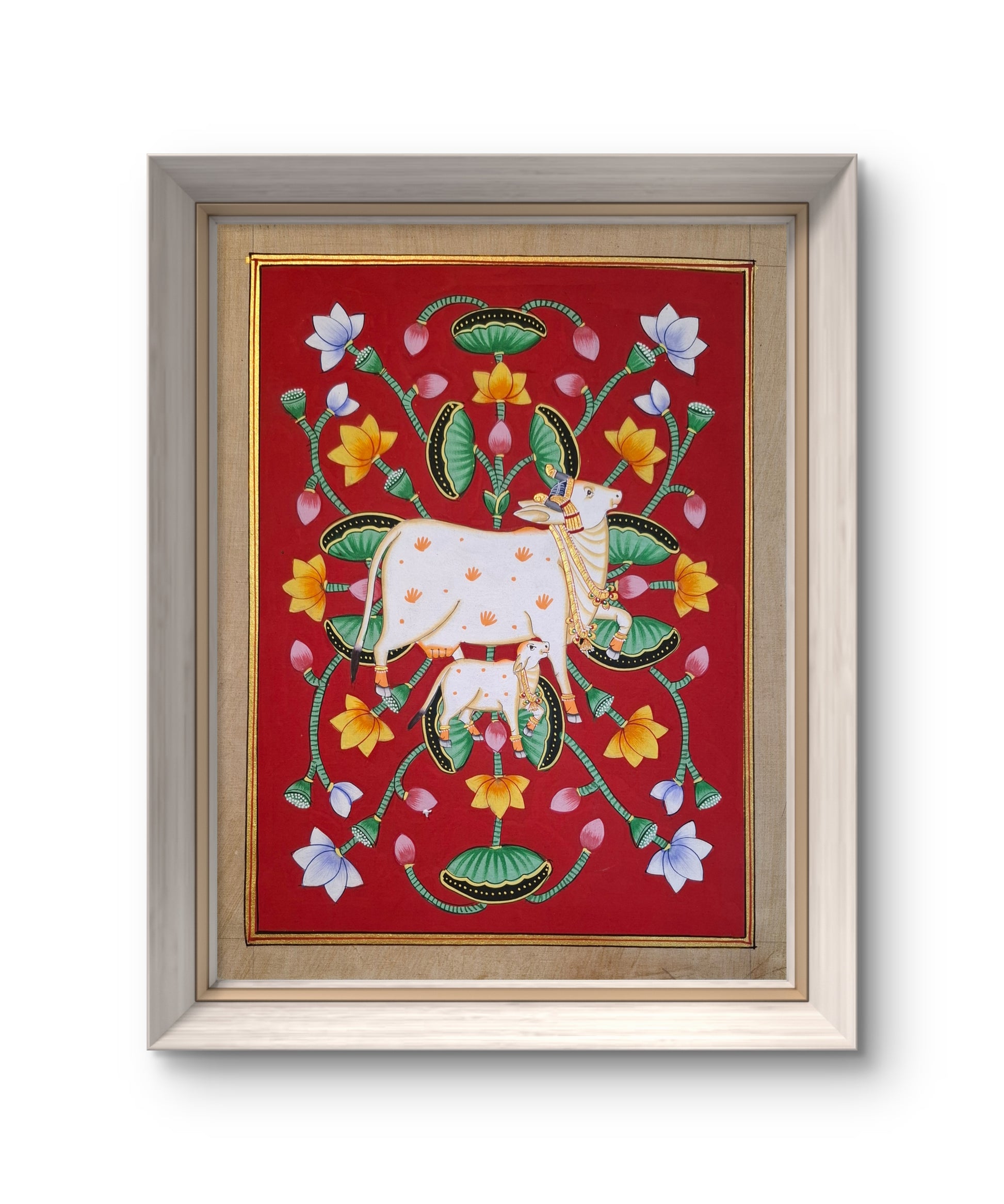 32 x 24 cms Hand-painted Pichwai Cow with Lotuses