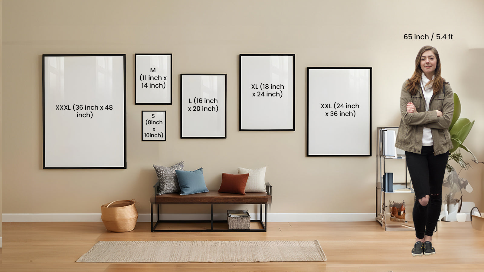 Choose the size of frame as per the size of the space available to you. You can use this image as a guide while choosing the option. We suggest that you can see the total space available for your frames and then opting for a combination of small frames or one single large piece