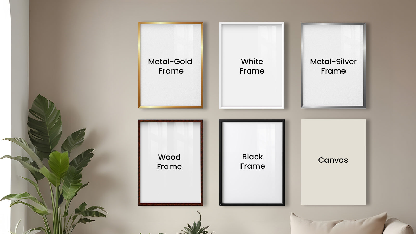 There are 6 options of frames to choose from. The Black, White and Wooden options are in fiber frame, and the gold and silver are premium metal frames