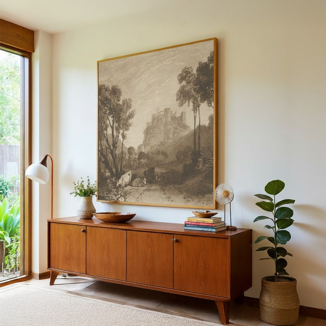 "The Castle Above the Meadows" painting beautifully showcases a majestic castle nestled atop a meadow, creating a serene, detailed masterpiece. This sophisticated piece enriches any space by bringing a serene and timeless atmosphere, perfect for those seeking refined art that inspires calm and grandeur.