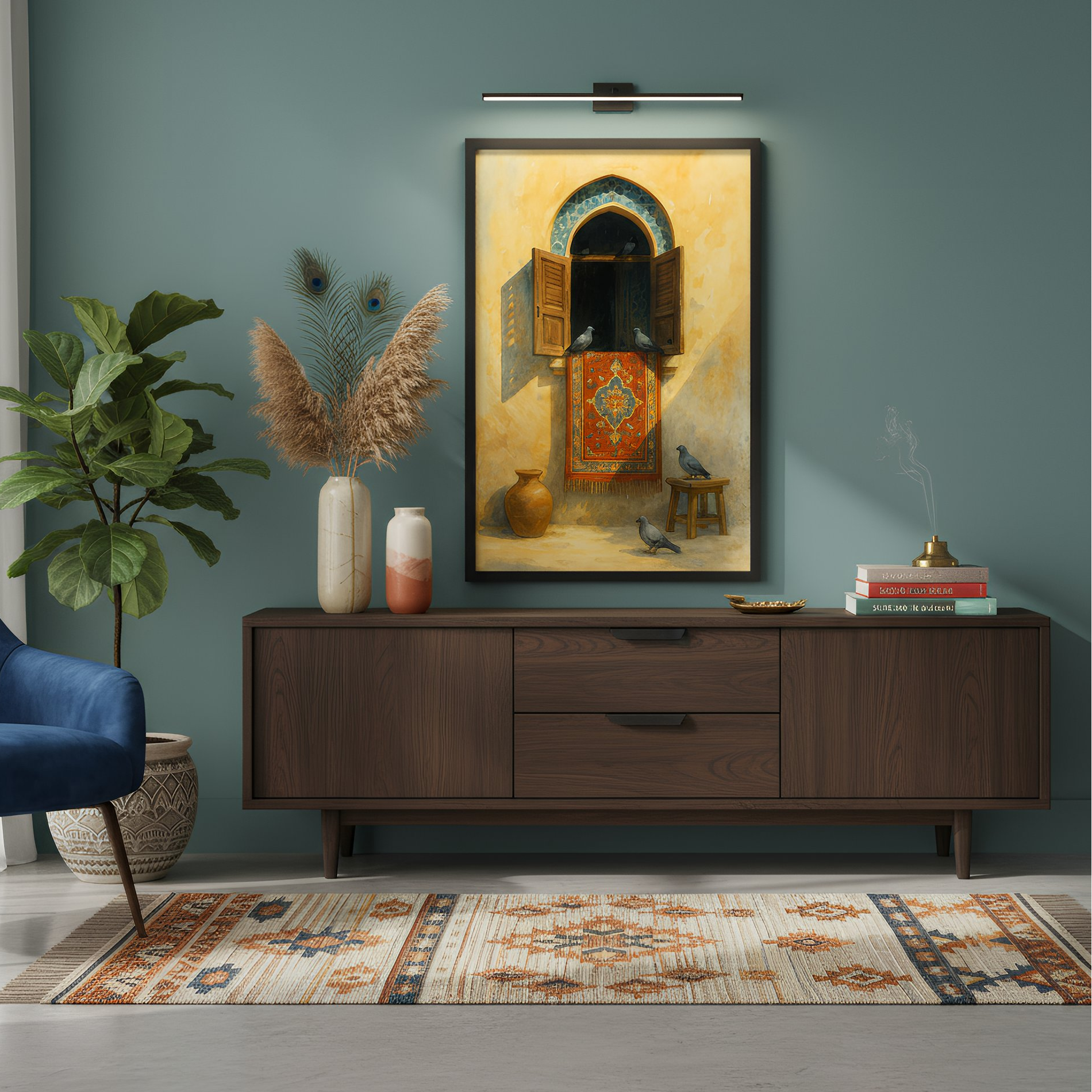 Choose the size of frame as per the size of the space available to you. You can use this image as a guide while choosing the option. We suggest that you can see the total space available for your frames and then opting for a combination of small frames or one single large piece