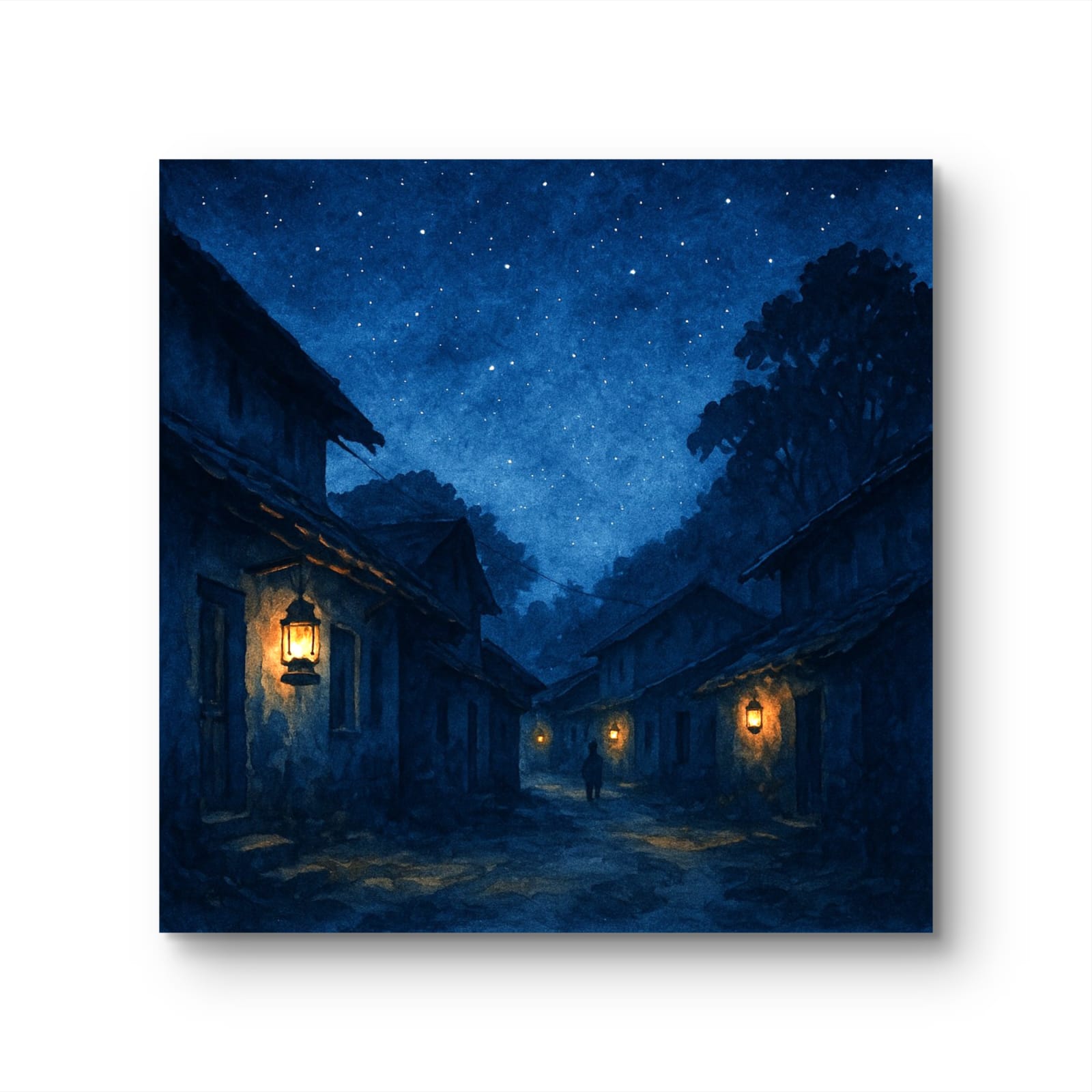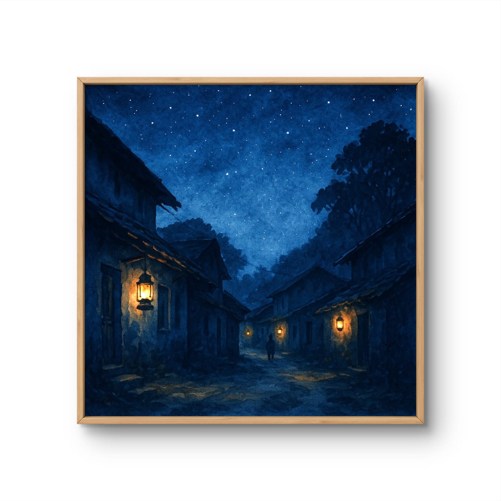 Experience the serene charm of rural life captured in this evocative nighttime village scene. This sophisticated artwork depicts a quiet street bathed in moonlight, with traditional architecture and warm glows emanating from distant windows. The interplay of shadows and luminescence creates an atmosphere of peaceful solitude, inviting contemplation. Perfect for those seeking to bring nostalgic elegance and tranquility into their living spaces, this piece celebrates the timeless beauty of village culture with refined artistic sensibility.