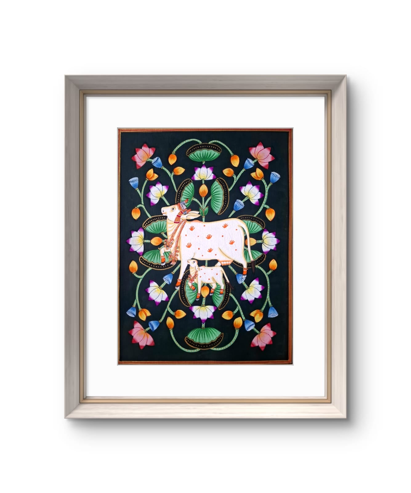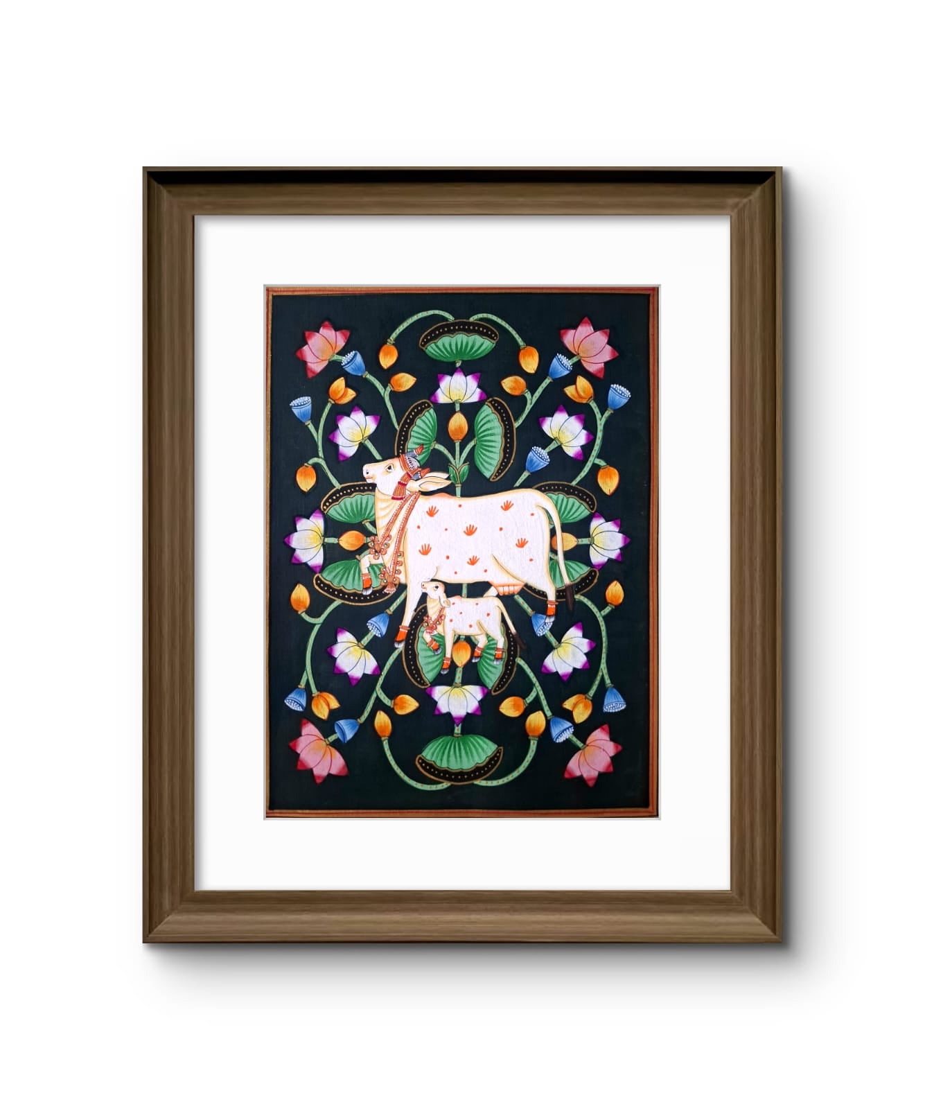 Pichwai Cow Black Background – a stunning traditional art piece capturing the sacred cow in classic Pichwai style against a dramatic black backdrop. This is perfect for gifting on occassions such as birthdays, anniversaries, housewarming or even a keepsake for foreign guests.